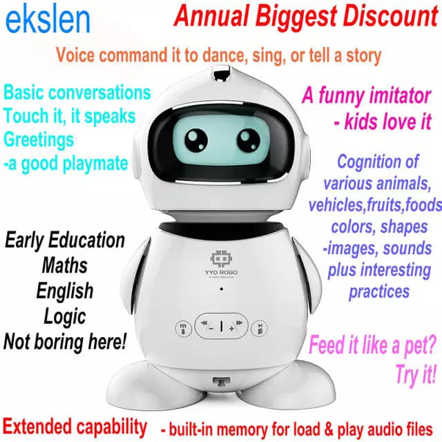 nconstruit en mémoire autour de 6 GB pour utilise à downlown des histoires/chansons fit avec leurs enfants. l’utilisateur peut télécharger les fichiers de PC/Ordinateur Portable par câble de données USB connecté à USB port à fond de robot.