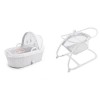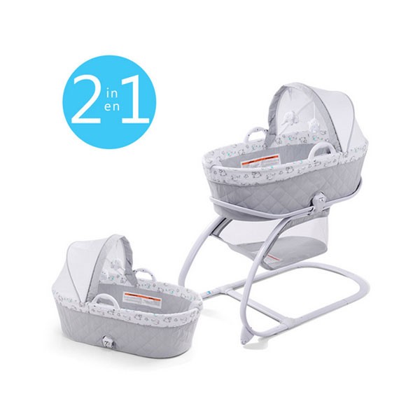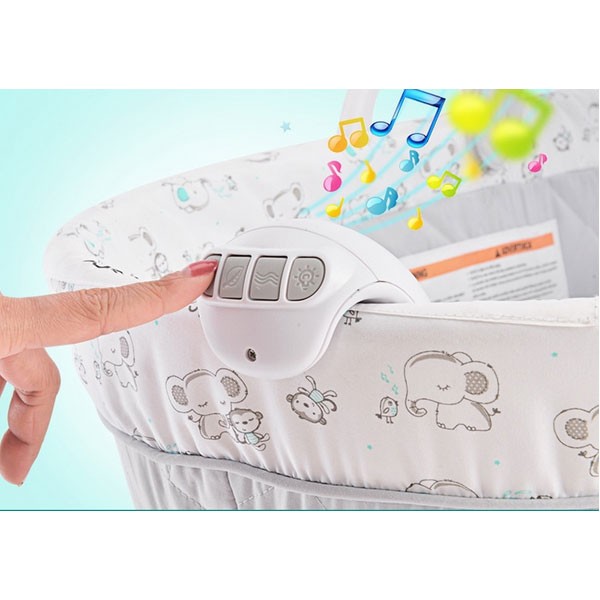 nSon couffin adorable se verrouille solidement sur son support pour le maintenir en place en toute sécurité, un bouton vert s’allume pour vous assurer que le berceau est correctement verrouillé. Le couffin se dégage facilement du support et permet de jouer de la musique douce, des sons et mélodies de la nature relaxantes et des vibrations apaisantes pour aider votre bébé à s’endormir. Une douce veilleuse s’ajoute aux autres fonctionnalités pour permettre aux parents de garder un œil sur leur petit ange endormi. Le support est équipé de roues qui permettent de déplacer le lit facilement et d’un panier de rangement facile à atteindre pour y ranger des couvertures et des fournitures supplémentaires.