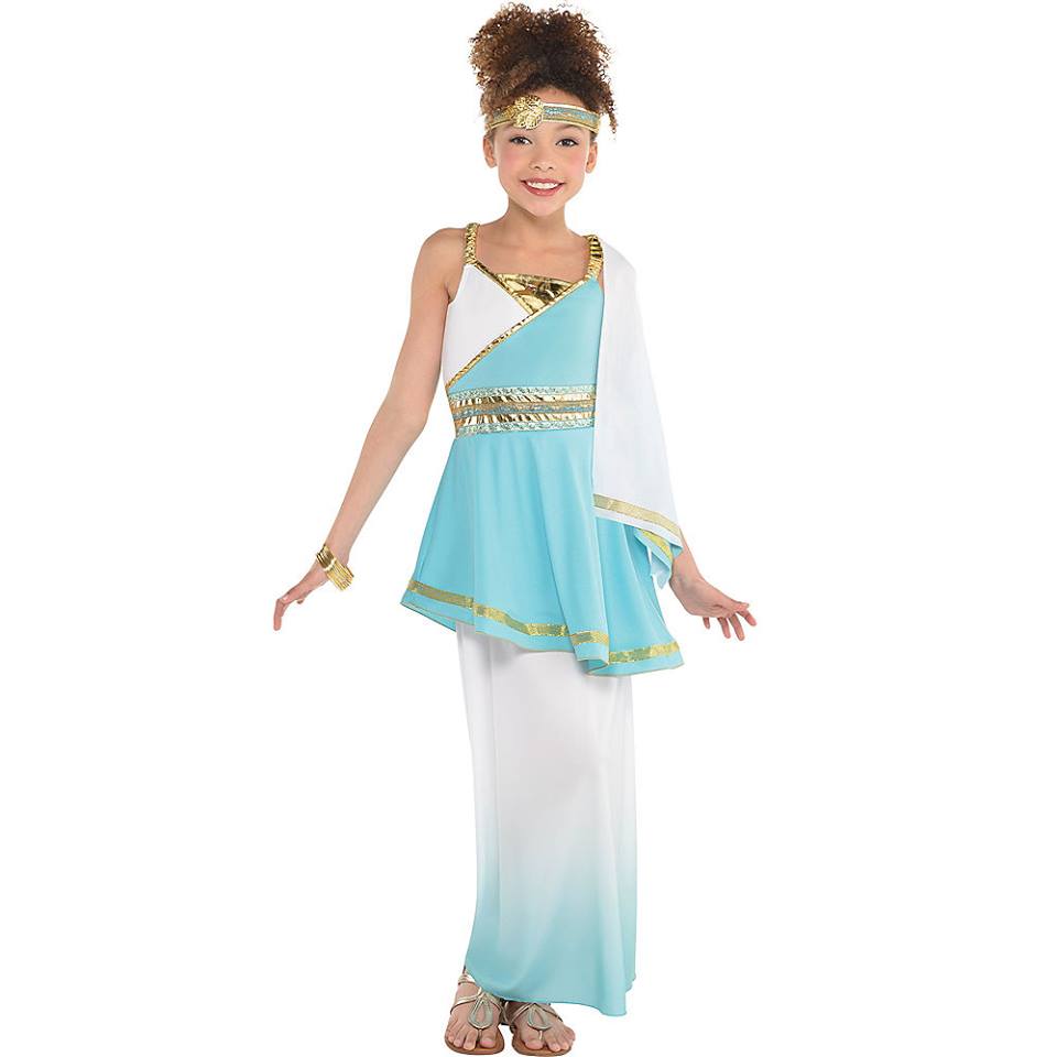 Cette tenue de la princesses Little Athéna conçue pour les filles comporte une tunique «amoureuse» bleue et blanche avec des bordures dorées brillantes, un insert doré au cou et une manche drapée blanche sur l’épaule gauche. Une longue robe longue et un bandeau étincelant bleu et or avec des accents de feuilles d’or complètent cet ensemble paradisiaque disponible en plusieurs tailles.