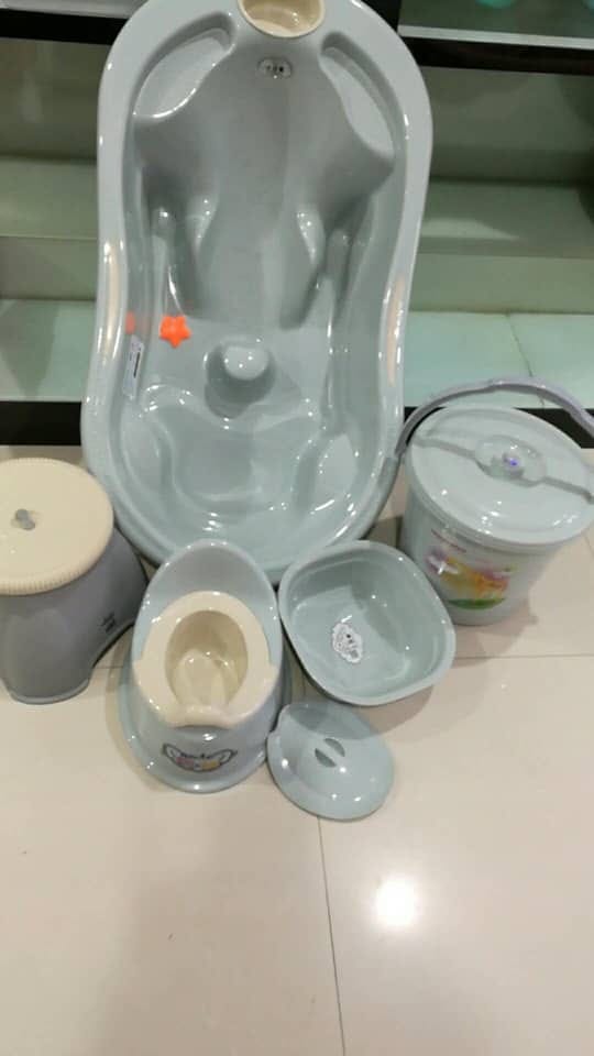 Ensembles baignoires 5piéces très pratique pour la toilette de vos bébé avec ses composition tels que la baignoire,le pot,le bol,le seau avec couvercle,le pot de chambre et tabouret disponibles en couleurs unisexe,fille et garçon