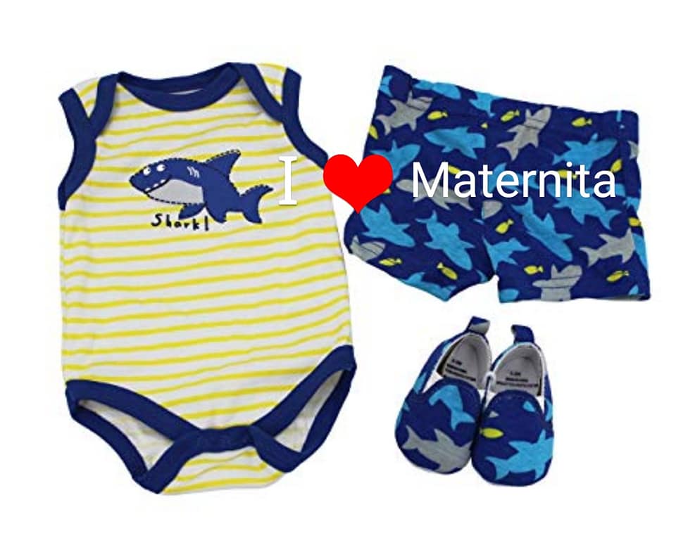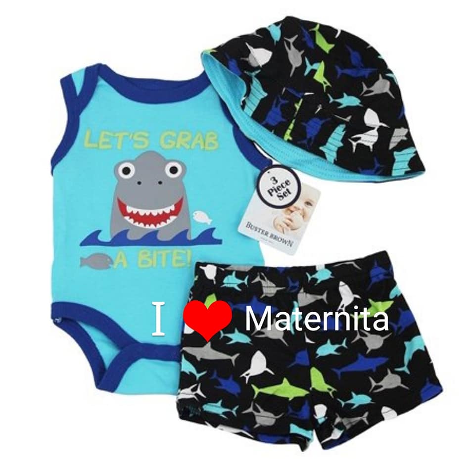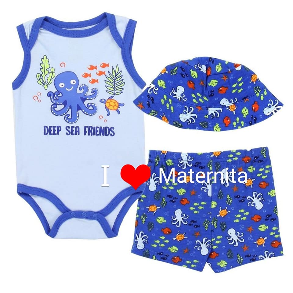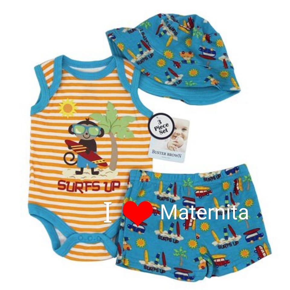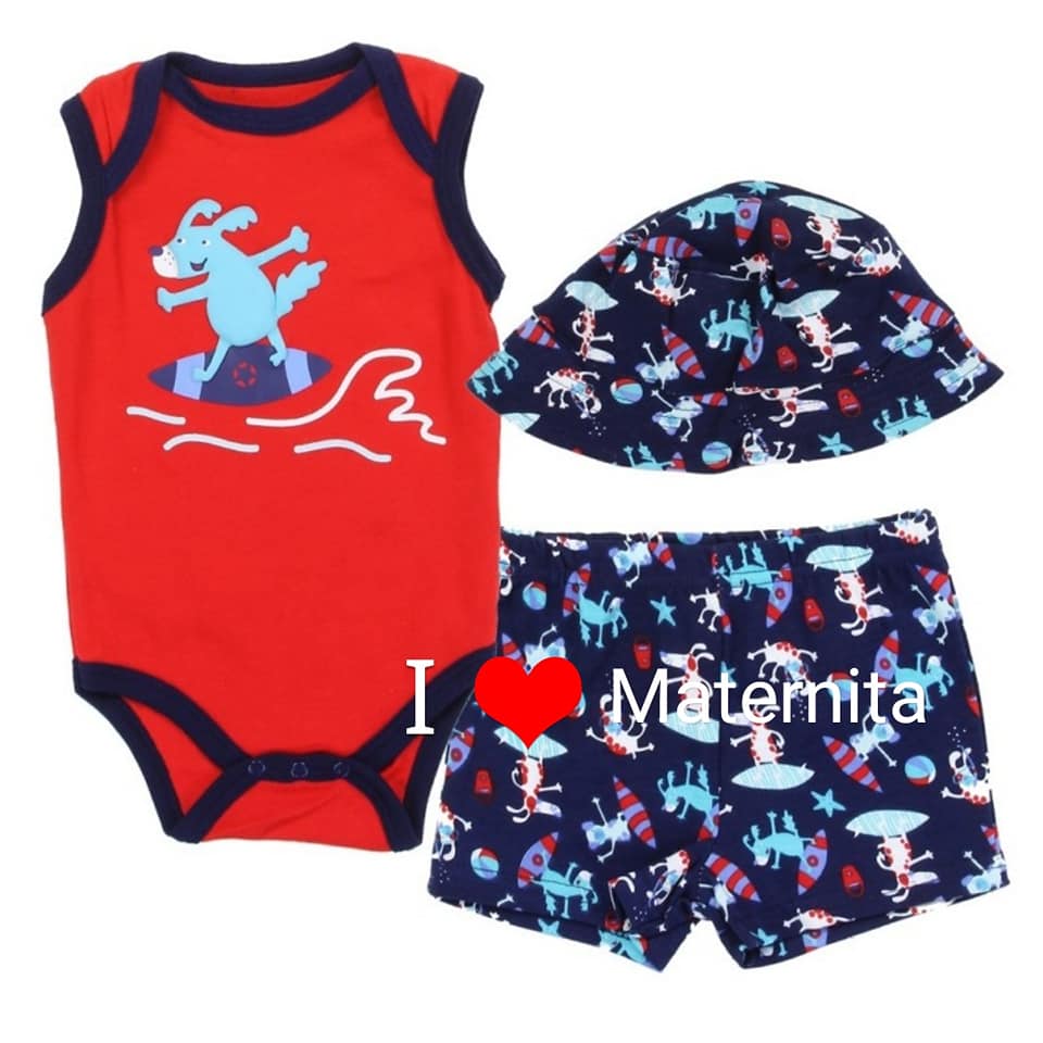 Ensembles bébé disponibles en plusieurs modèles et couleurs à partir de 3mois à 24mois en 3pièces composés de body petit bateau, short, chaussures ou chapeau.