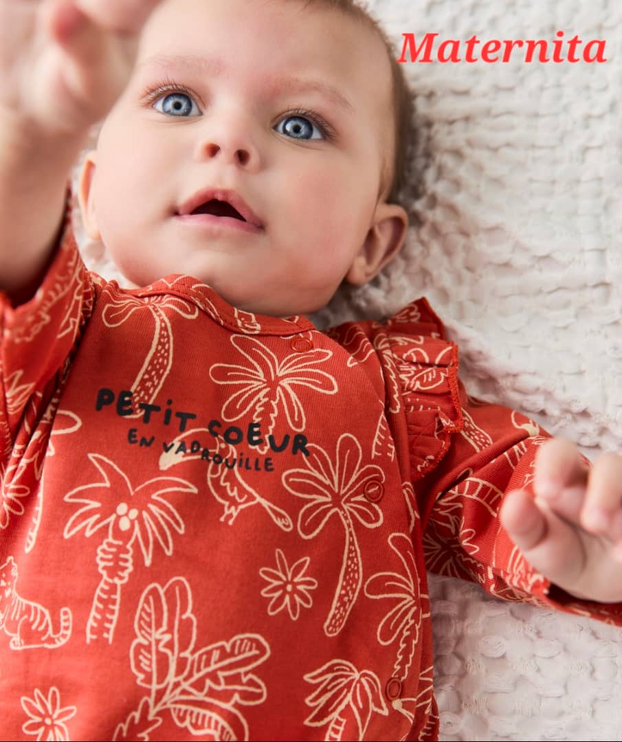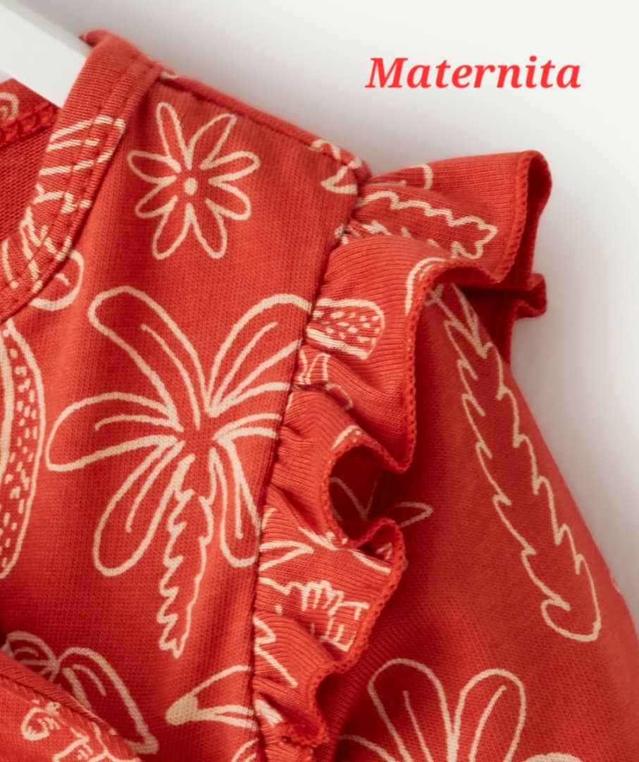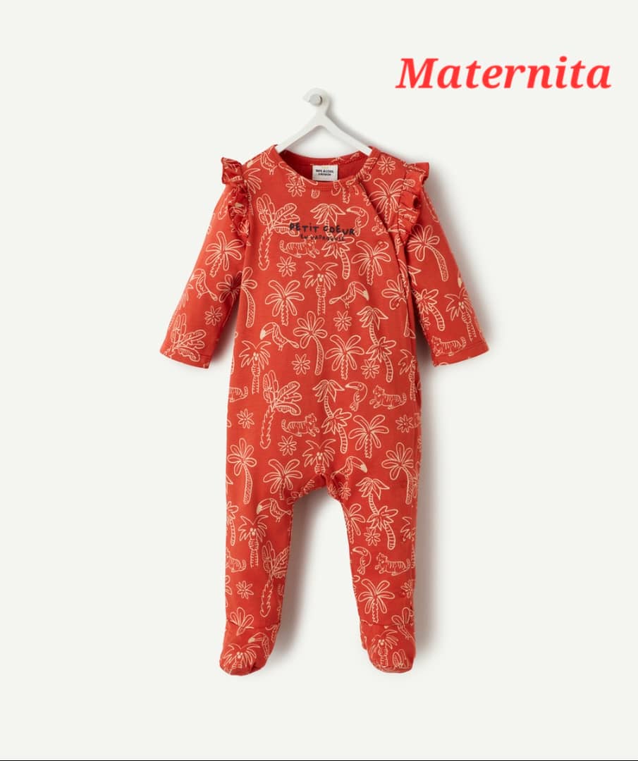 nVous allez craquer pour ce dors-bien en coton bio coloris rouille et son imprimé écru représentant des palmiers et oiseaux. Les détails volantés sur les épaules ajoutent une touche très girly !