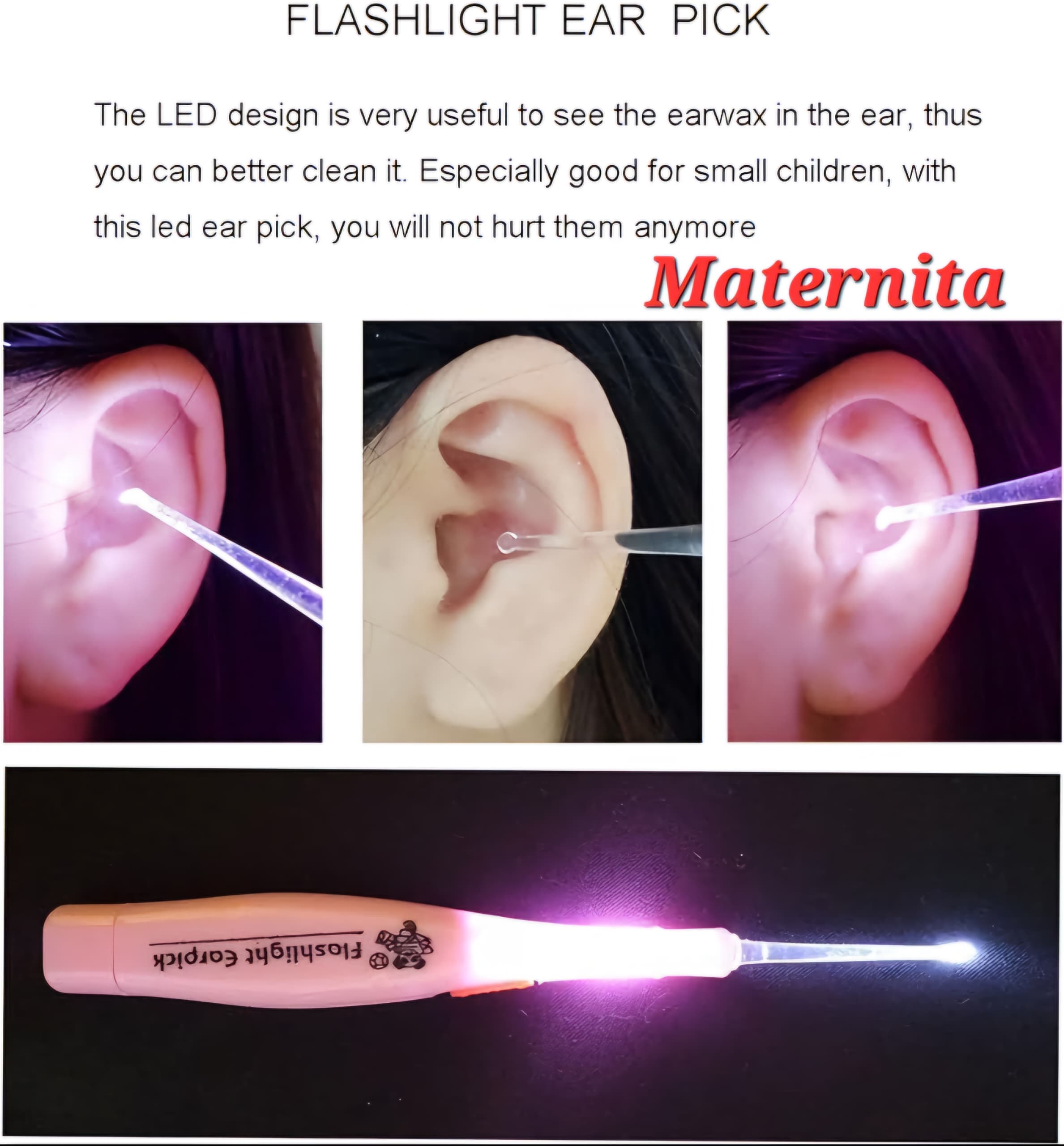Le retrait du cérumen de lampe de poche LED est très utile pour les petits enfants, avec le design LED, vous pouvez voir clairement le cérumen afin qu’il ne blessera pas l’oreille de votre enfant lorsqu’il est nettoyé l’oreille