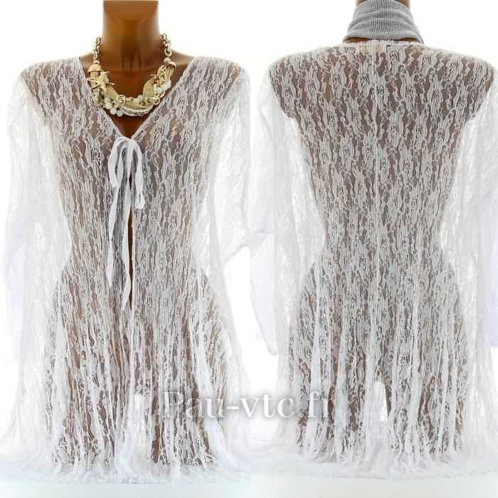 Belle tunique de plage ou même portatif pour les petits sorties avec un ajourée d’été. Coupe ample, tissu ajouré délicat, motif floral.nnnnEncolure en V, manche courte kimono en pente. Couper le cou, élastique sous le buste