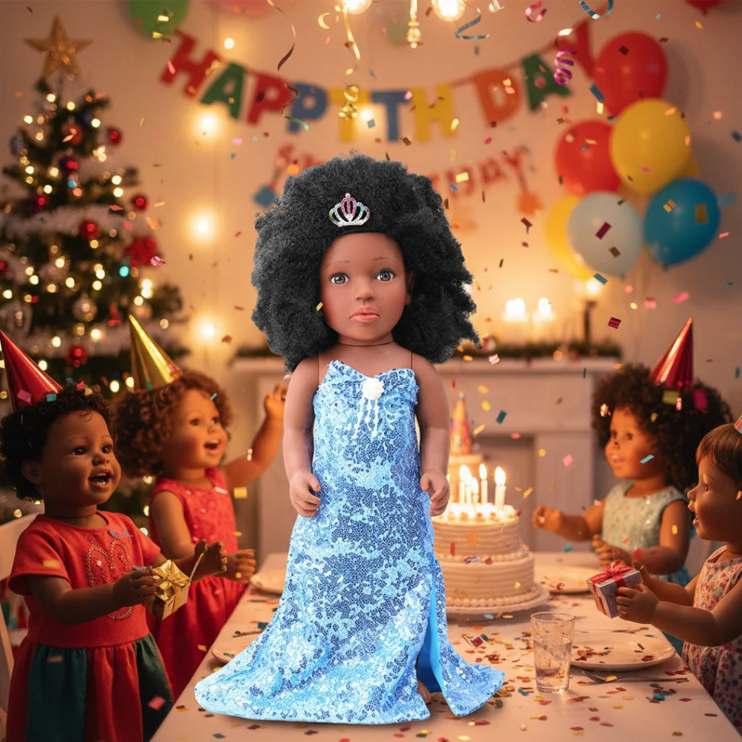 Avec sa chevelure afro volumineuse, son petit diadème scintillant et sa tenue de soirée brillante, elle est parfaite pour stimuler l’imagination et créer des moments magiques.