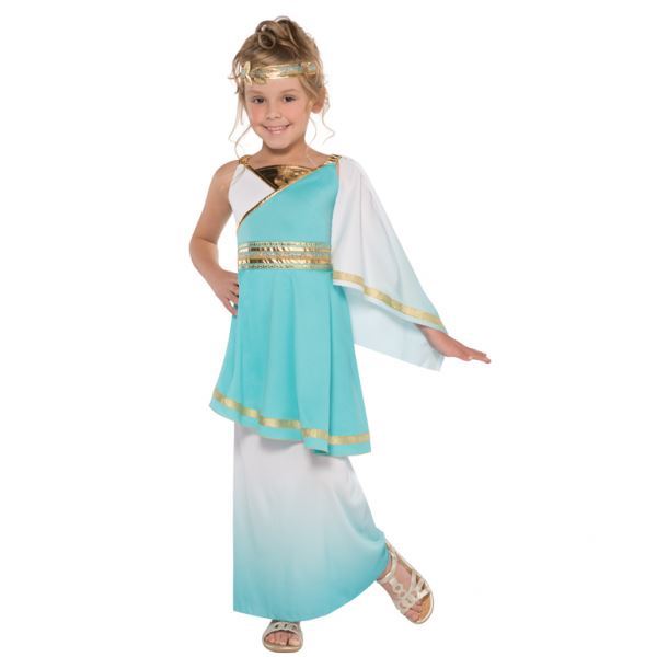 Cette tenue de la princesses Little Athéna conçue pour les filles comporte une tunique «amoureuse» bleue et blanche avec des bordures dorées brillantes, un insert doré au cou et une manche drapée blanche sur l’épaule gauche. Une longue robe longue et un bandeau étincelant bleu et or avec des accents de feuilles d’or complètent cet ensemble paradisiaque disponible en plusieurs tailles.