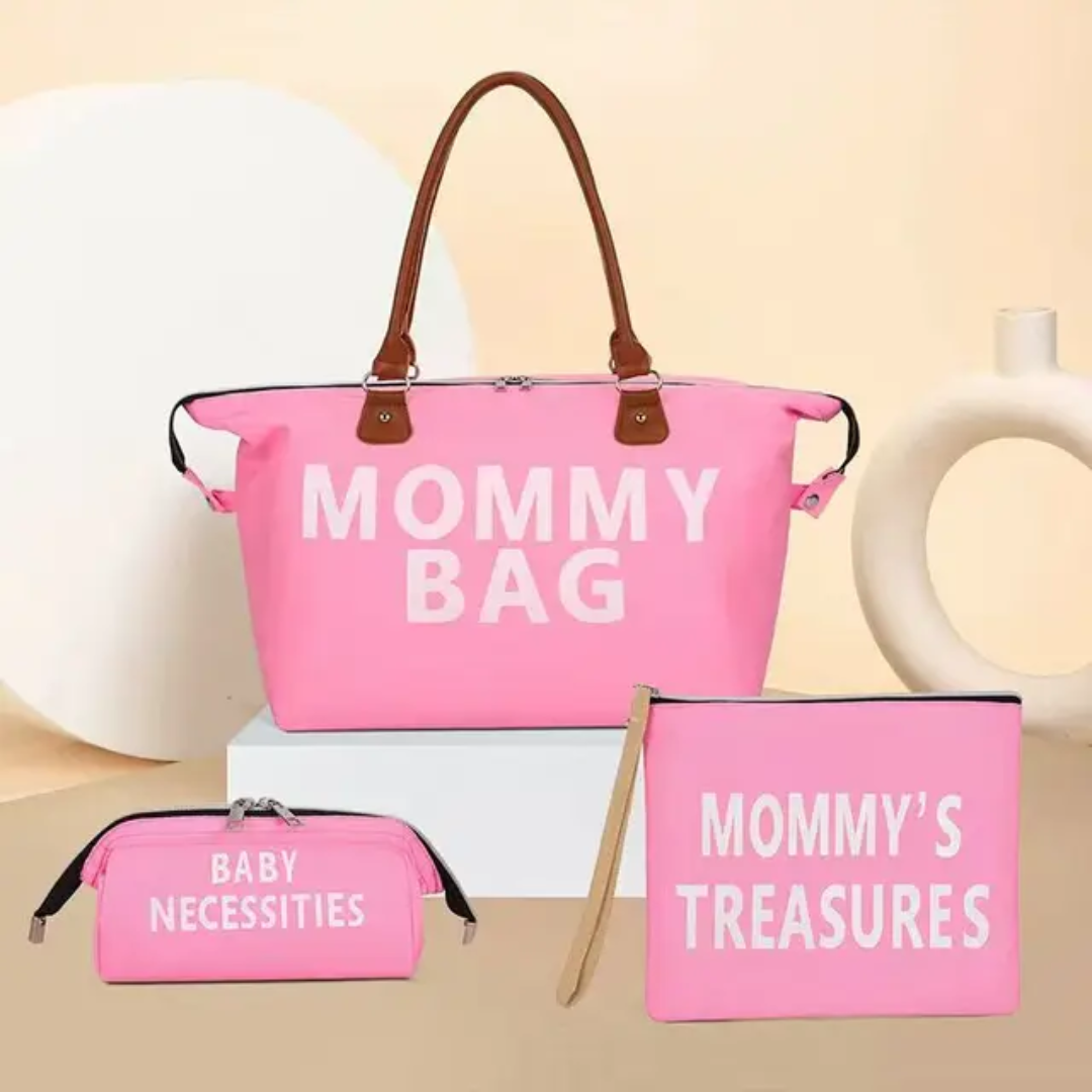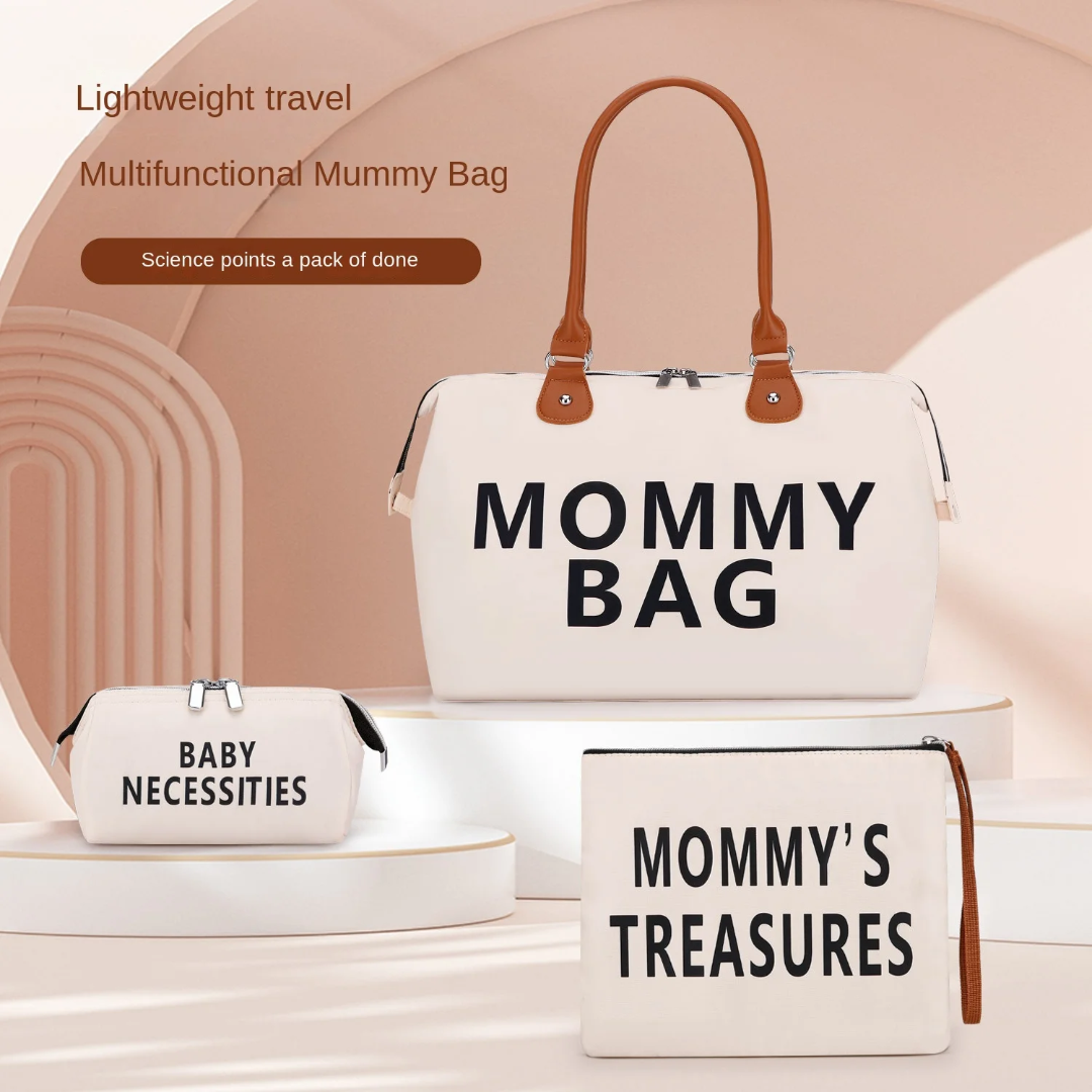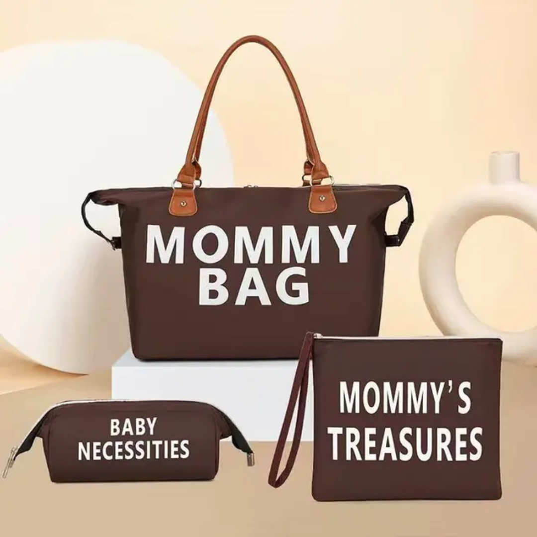 Sac à langer Mommy Bag grand format avec trousse et pochette assorties. Spacieux, élégant et pratique pour transporter tous les essentiels de bébé lors des sorties, voyages ou à la maternité.
