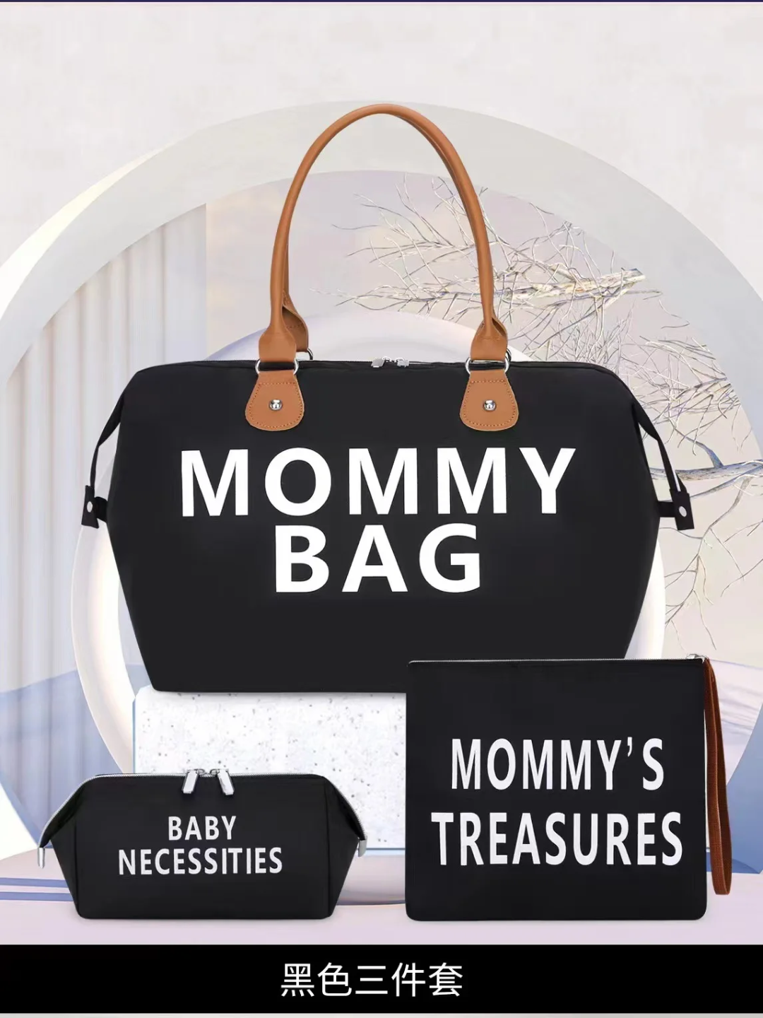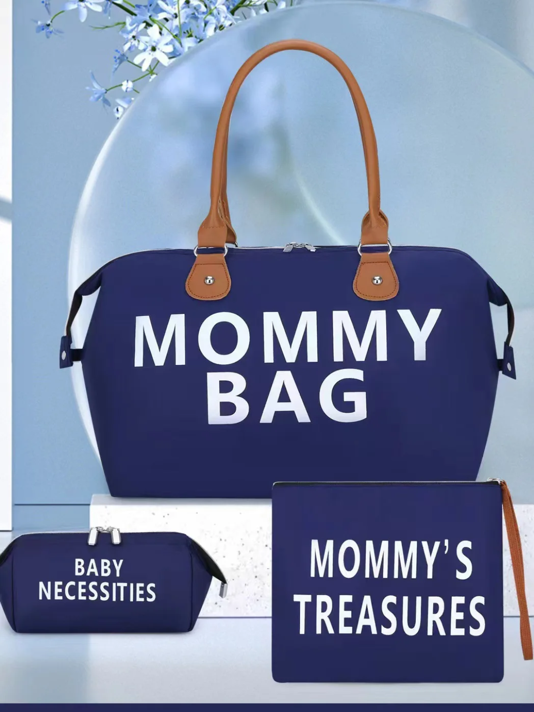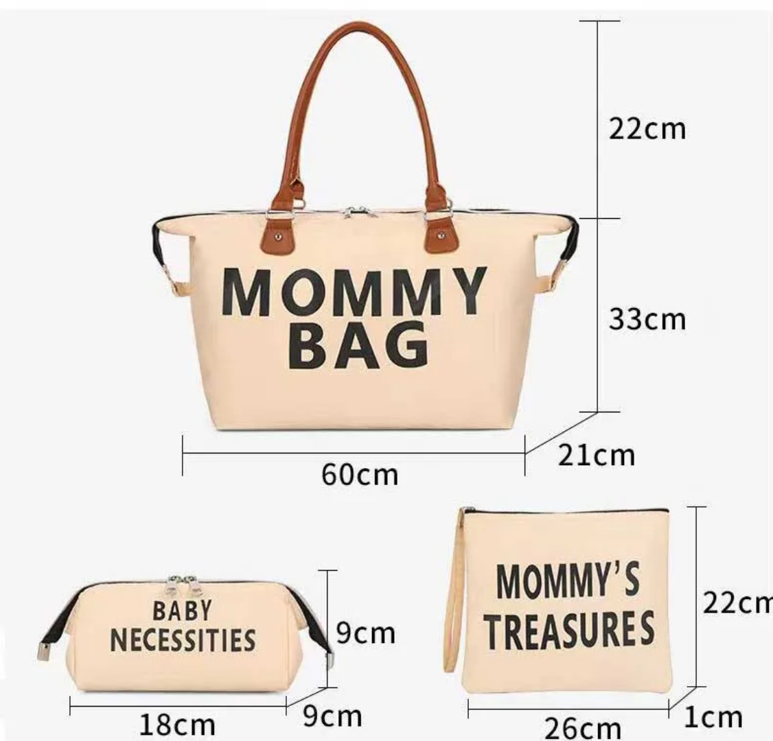 Sac à langer Mommy Bag grand format avec trousse et pochette assorties. Spacieux, élégant et pratique pour transporter tous les essentiels de bébé lors des sorties, voyages ou à la maternité.