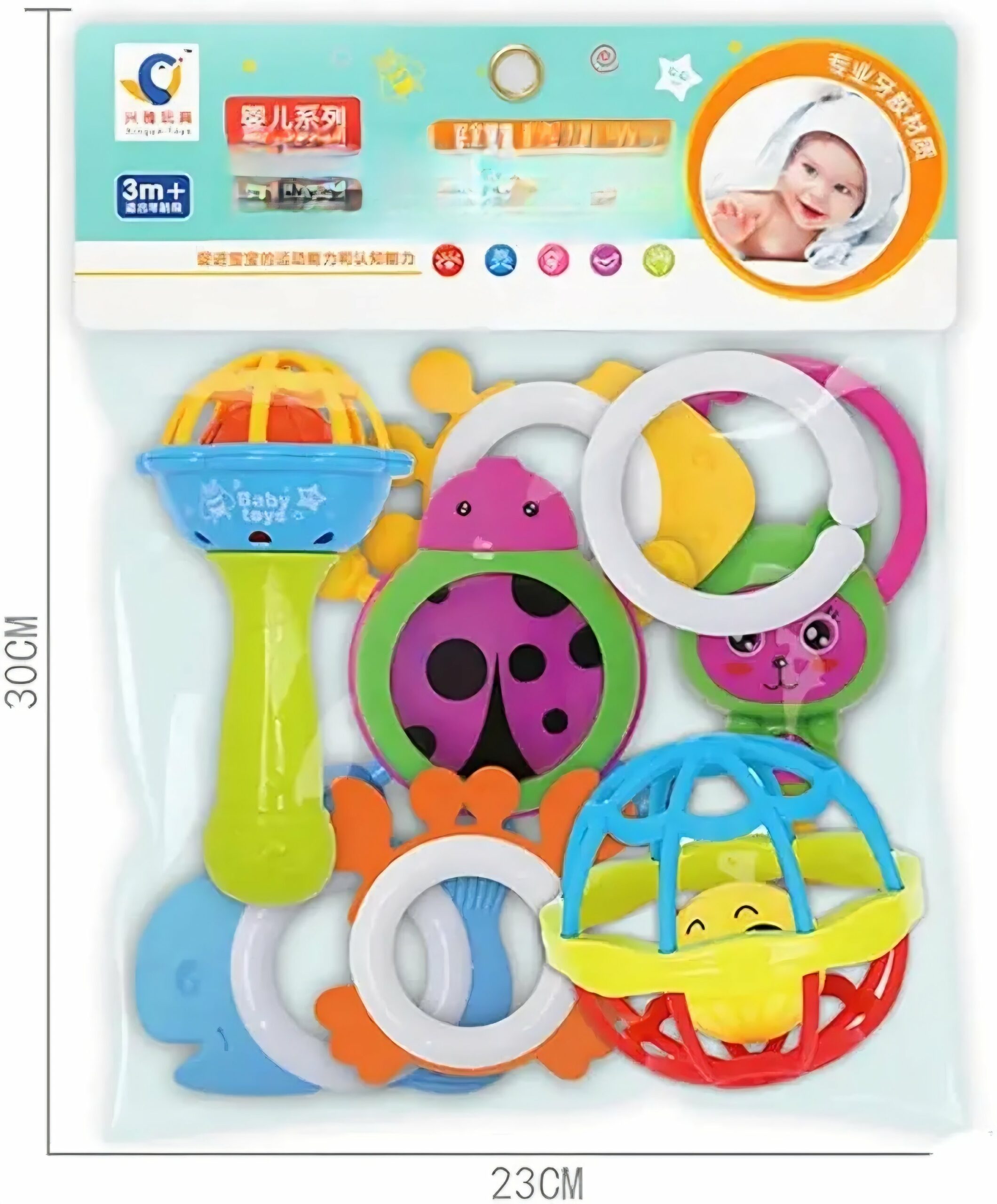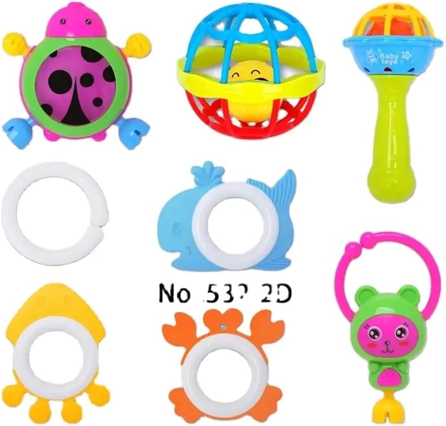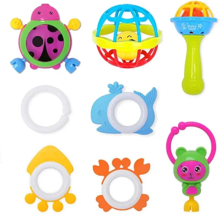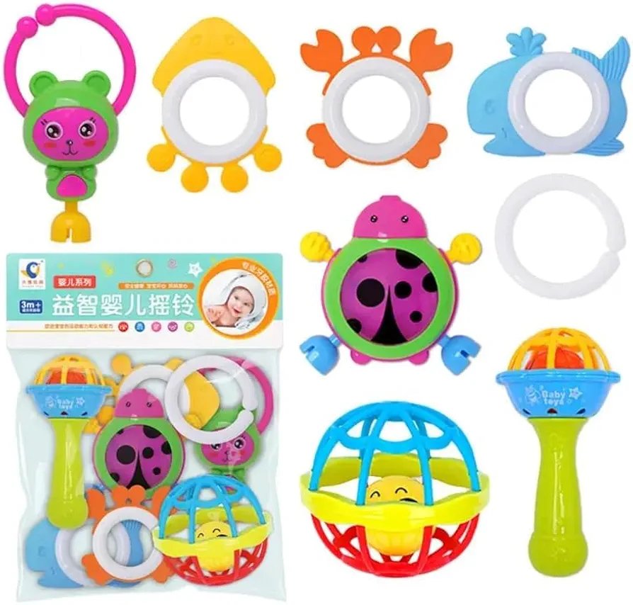 ce coffret coloré contient plusieurs hochets aux formes amusantes : coccinelle, baleine, crabe, ourson, balle sonore et autres jouets faciles à saisir.