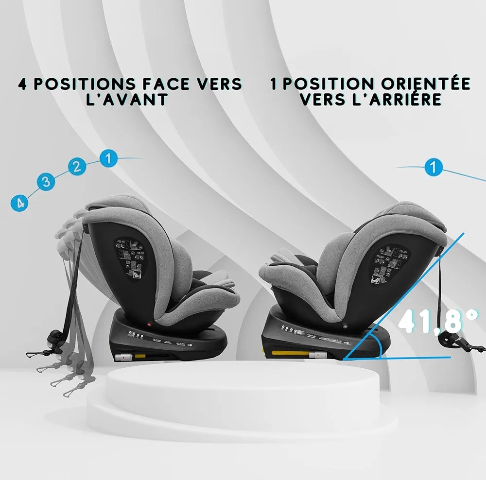 Rotation complète 360° permettant une installation facile de l’enfant et un passage simple entre la position dos et face à la route.