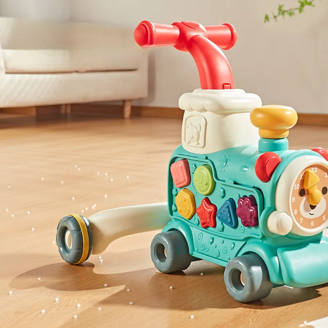 Offrez à votre enfant un jouet évolutif, ludique et éducatif avec ce trotteur bébé en forme de train musical 5-en-1.